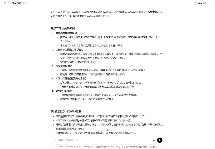 その志望理由を生成AIに入力し、大学入試の志望理由書として、どのような要素が足りていないと思うのか、説得力があるのかなど、聞いてみましょう。