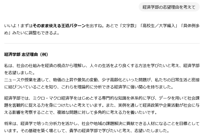 「この総合型選抜の志望理由書を採点して」などと聞いてみると、良いところ・改善が必要なところを教えてくれるので便利です。